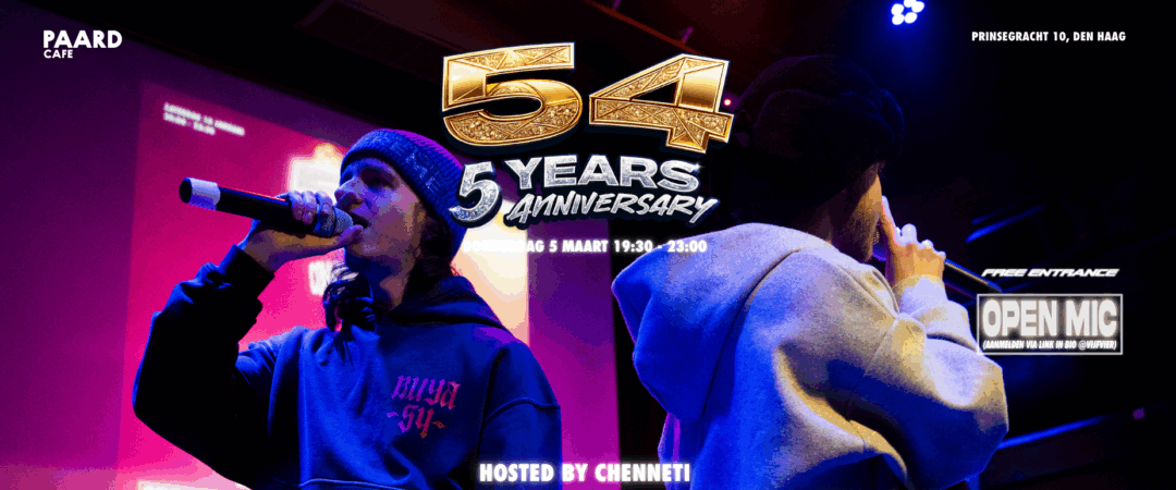 54 bestaat 5 jaar! En dat vieren we donderdag 5 maart! Naast optredens van Trevv, Purple25, H4rley en Sweaker kun je je aanmelden voor de open mic, of een pop-up studiosessie doen. Be there! De avond wordt gehost door Chenneti.