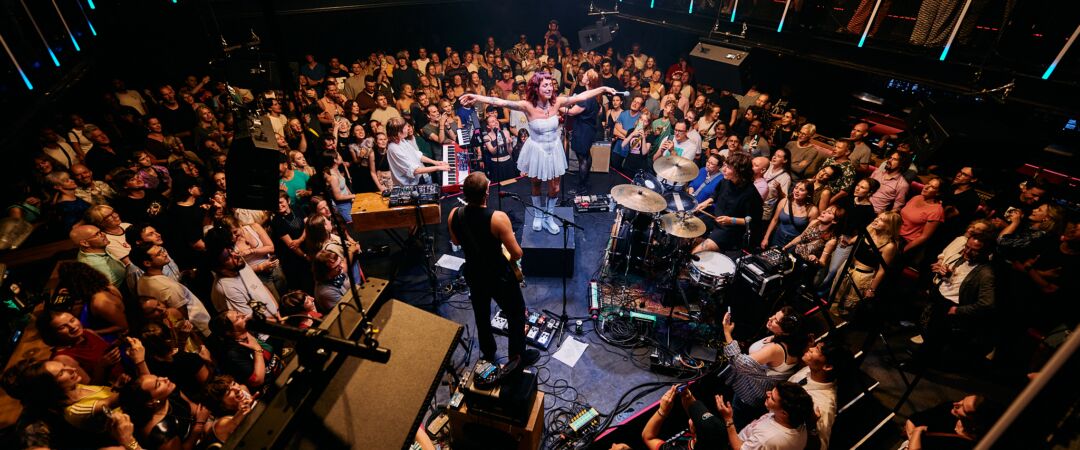poppodium omgebouwd tot unieke locatie, waarbij acts in het midden van de zaal staan en het